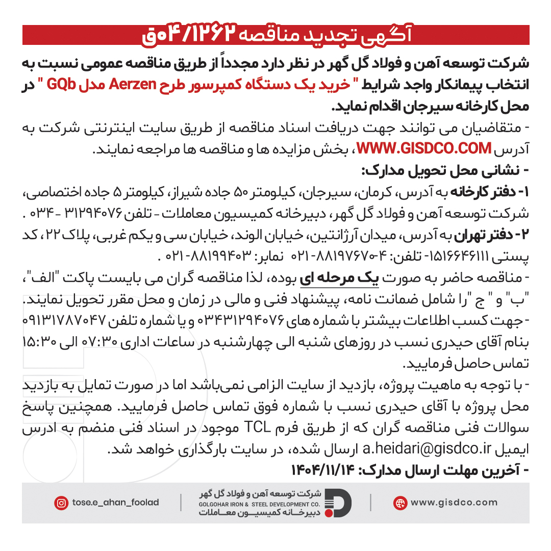 آگهی تجدید مناقصه خرید یک دستگاه کمپرسور طرح Aerzen مدل GQb (تکرار مرتبه دوم) شرکت توسعه آهن و فولاد گل گهر