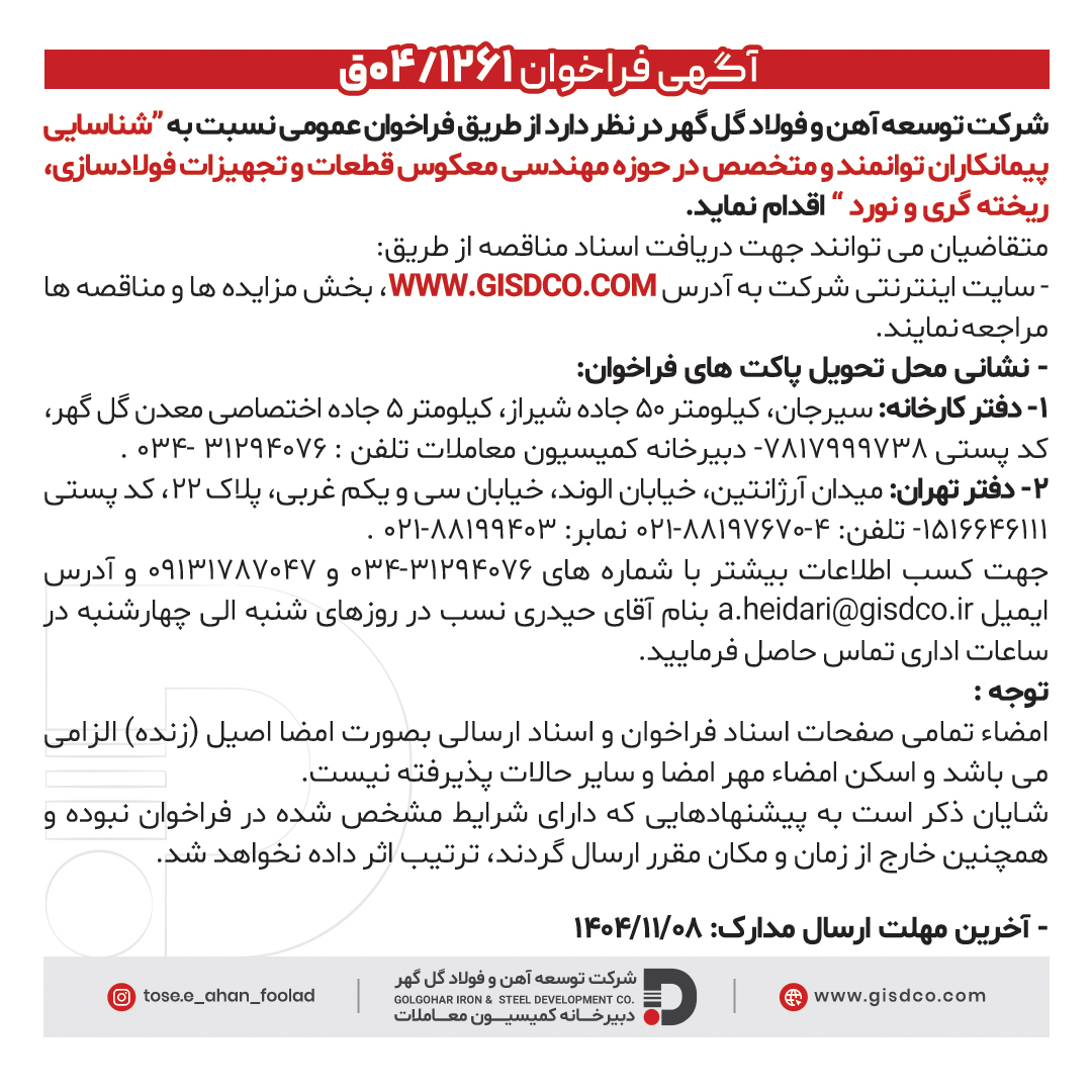 آگهی فراخوان شناسایی پیمانکاران توانمند و متخصص در حوزه مهندسی معکوس قطعات و تجهیزات فولادسازی، ریخته گری و نورد شرکت توسعه آهن و فولاد گل گهر (آگهی1261)